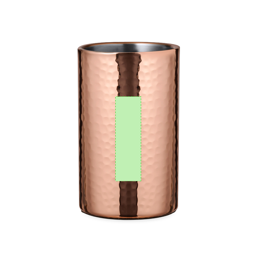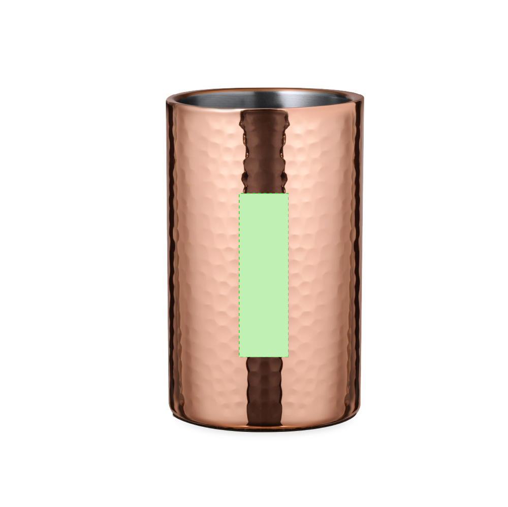 Eleganter Kühler mit 1 Liter Fassungsvermögen aus Edelstahl mit verzinkter Kupferbeschichtung. Mit seinem originellen Design und der glänzenden Oberfläche ist es ein perfektes Accessoire, um kalte Getränke stilvoll zu präsentieren. Präsentiert in einer exklusiven individuellen schwarzen Designbox.