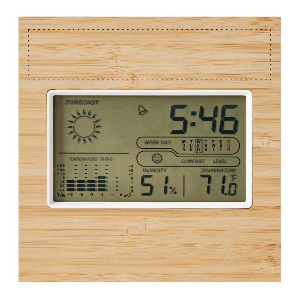 Wetterstation FORECAST: mit Bambusfront, Alarmfunktion, Datums- und Zeitanzeige, Hygrometer und Thermometer (°C und °F), ausklappbarer Aufsteller und Loch zur Wandmontage auf der Rückseite, batteriebetrieben (2x AAA Batterien nicht enthalten), in Box