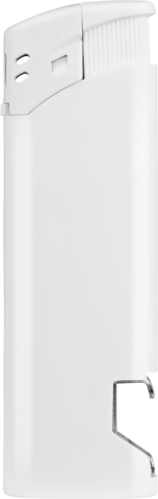 Das Reibradfeuerzeug aus Kunststoff der Marke GO verfügt zusätzlich über einen Flaschenöffner. Diese Kombination macht der Werbeartikel noch beliebter und zu einem Werbeklassiker. Das Feuerzeug ist nachfüllbar.