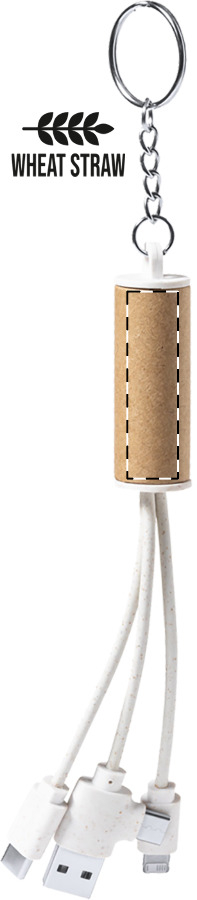 Schlüsselanhänger mit USB-Ladekabel aus Recyclingpapier und Weizenstrohkunststoff mit Mikro-USB, USB-C und Lightning-Steckern. Eingang über USB oder USB-C.
